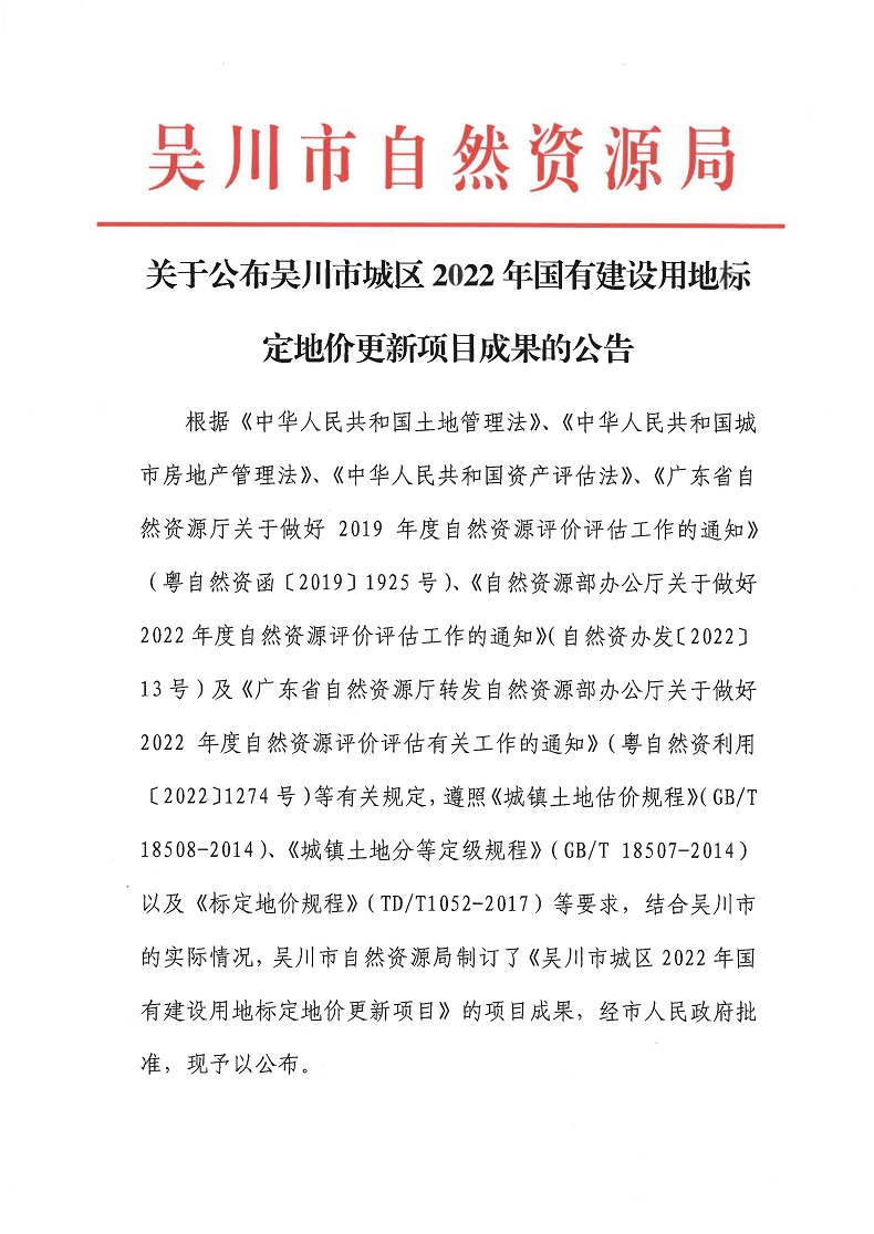 | 名称: | 关于公布吴川市城区2022年国有建设用地标定地价更新项目成果的公告 | ||