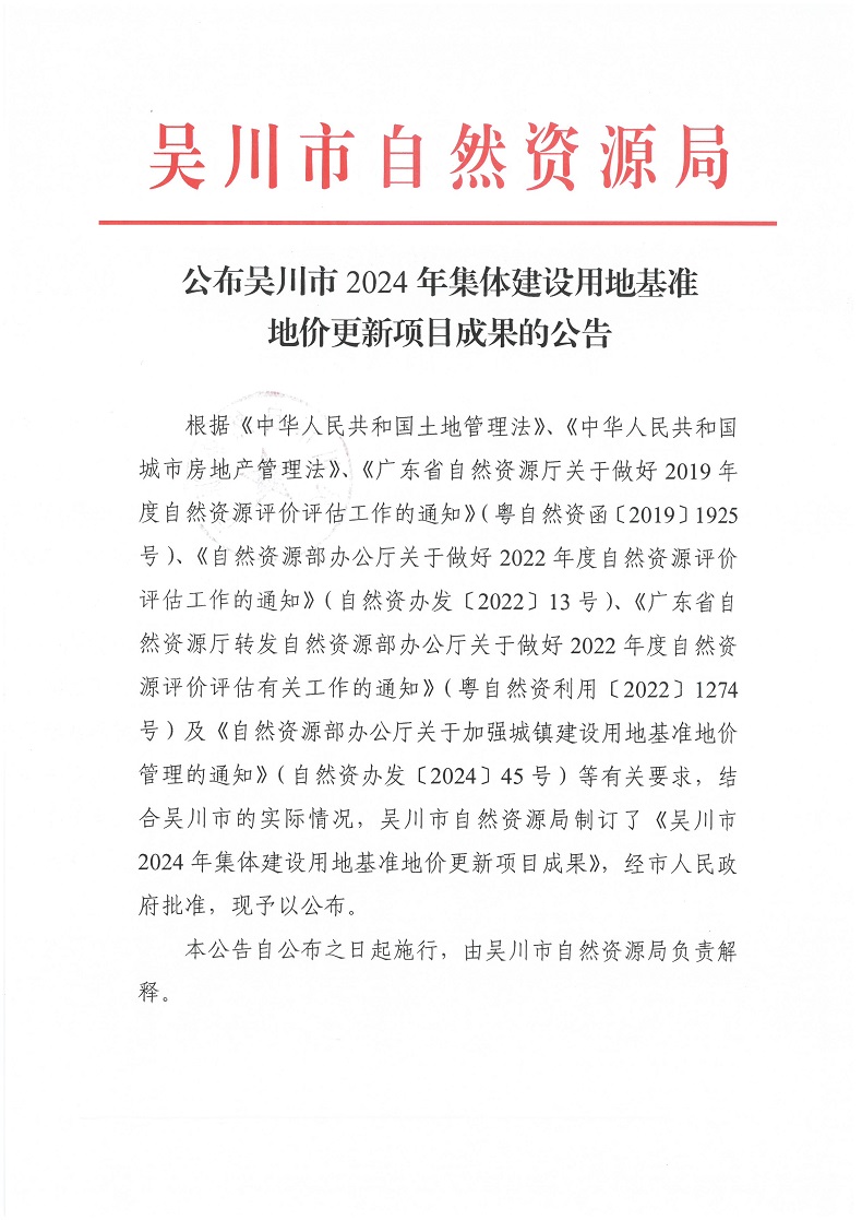 关于公布吴川市2024年集体建设用地基准地价更新项目成果的公告