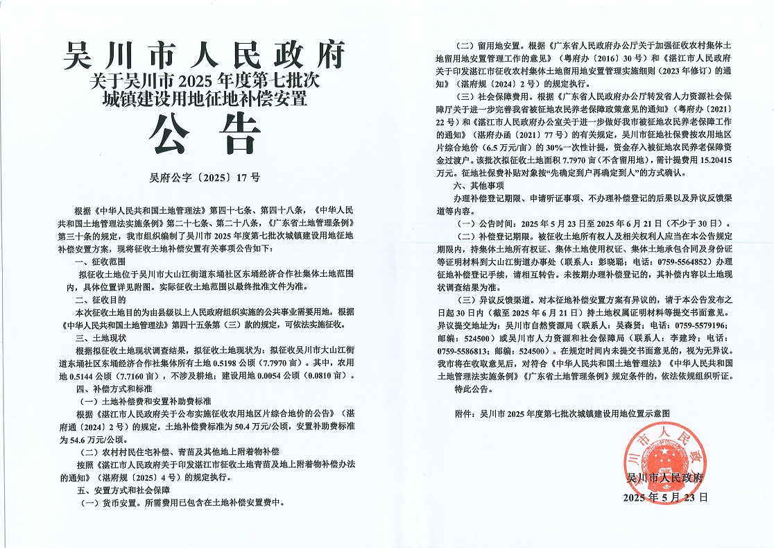 吴川市2025年度第七批次城镇建设用地征地补偿安置公告