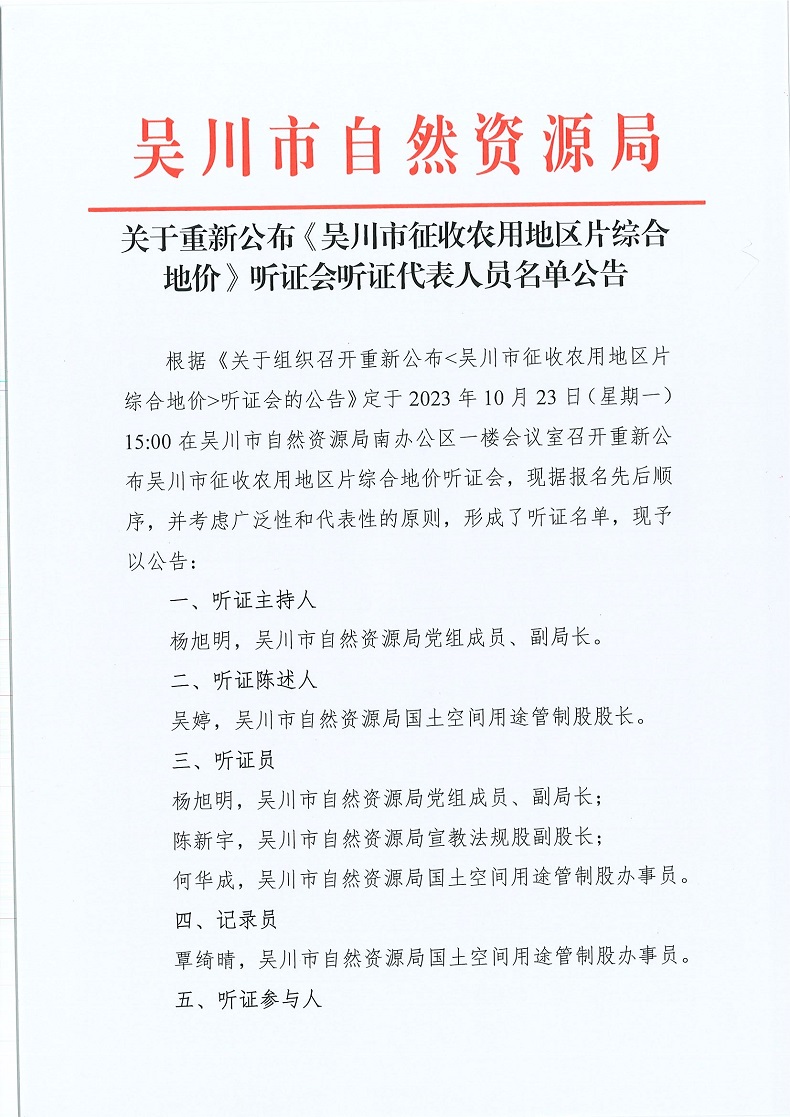 关于重新公布《吴川市征收农用地区片综合地价》听证会听证代表人员名单公告