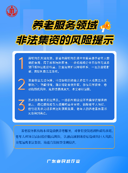 近期,一些不法分子假借“养老服务”“健康养老”等名义,以“高利息、高回报”为诱饵实施非法集资活动吸收老年人资金,给老年人造成严重财产损失和精神伤害。广东民政发布海报,提醒老年人远离非法集资。让我们一起往下看看吧!