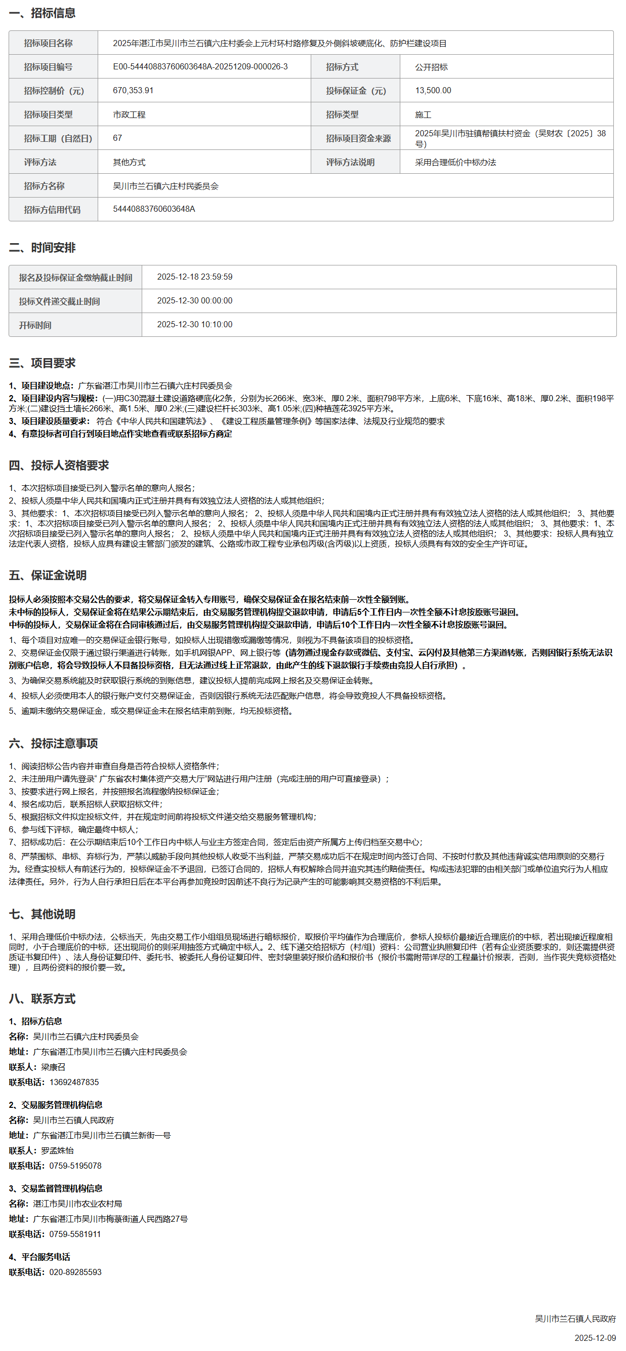 2025年湛江市吴川市兰石镇六庄村委会上元村环村路修复及外侧斜坡硬底化、防护栏