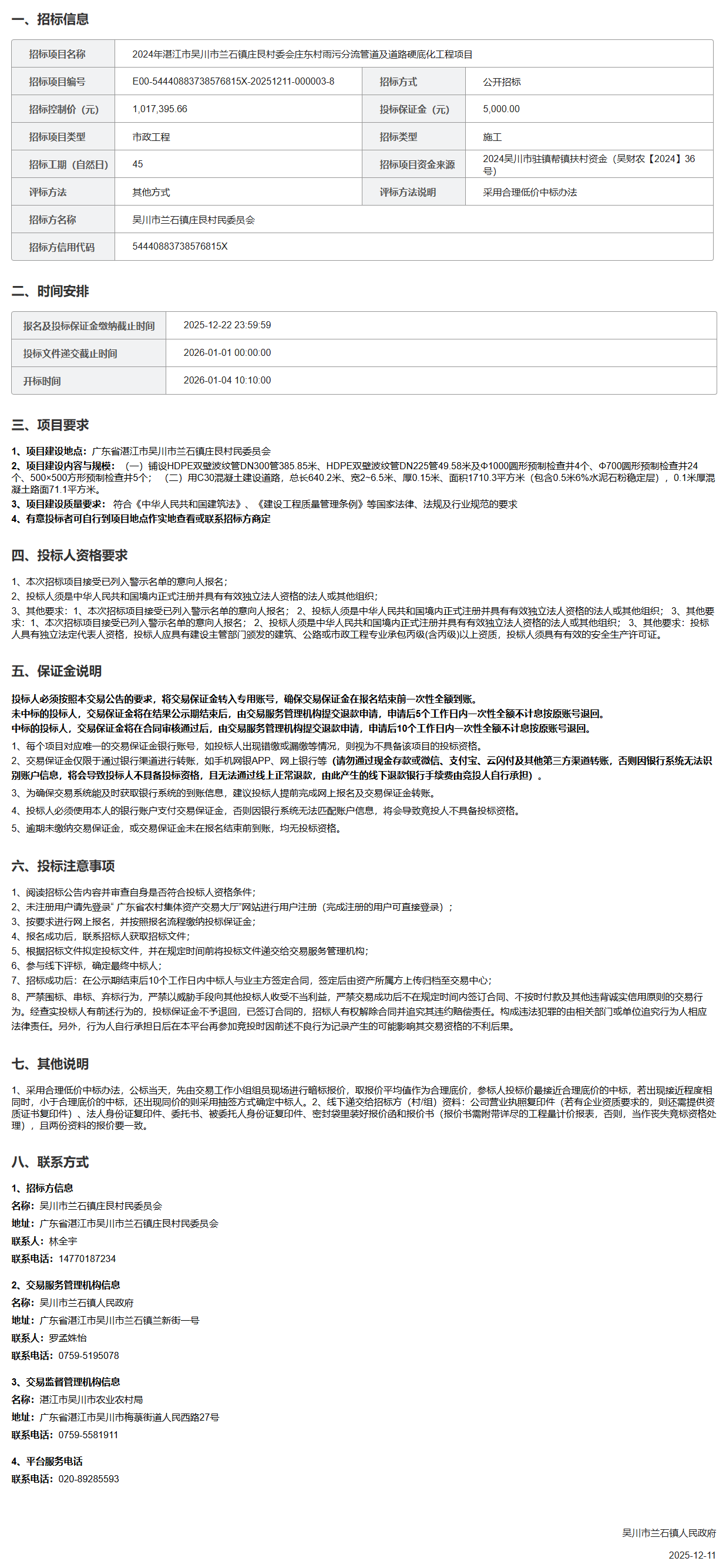 2024年湛江市吴川市兰石镇庄艮村委会庄东村雨污分流管道及道路硬底化工程项目