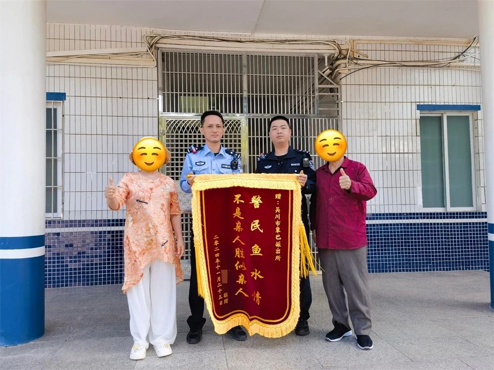 11月26日上午,方女士夫妇二人来到覃巴派出所,将一面印有“警民鱼水情 不是亲人胜似亲人”烫金大字的锦旗送到民警辅警的手中,表达对民警辅警的感激之情。