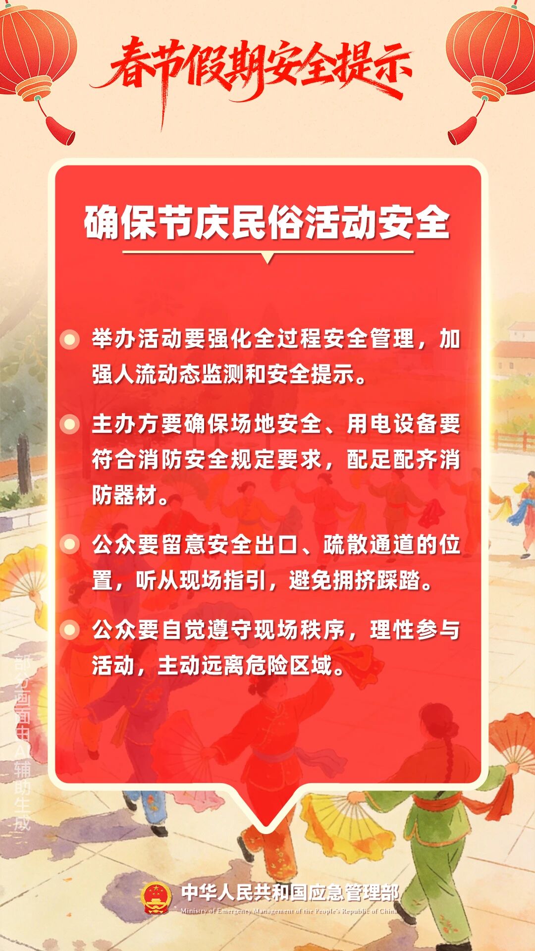 春节假期将至,用火用气用电增加;群众出游、自驾出行、客货运输迎来高峰,灯会、庙会、促销庆典等大型活动多,宾馆、饭店、市场、商超等场所人流密集;烟花爆竹产销燃放正值旺季,煤炭、石化等企业保供压力加大;低温雨雪冰冻等恶劣天气多发;各类风险隐患交织叠加,安全生产须臾不可放松,这份春节假期安全提示请查收。