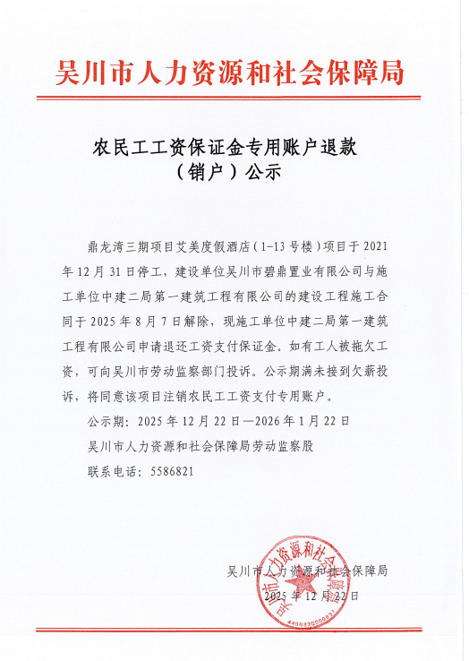 鼎龙湾三期项目艾美度假酒店(1-13号楼)项目农民工工资保证金专用账户退款(销户)公示