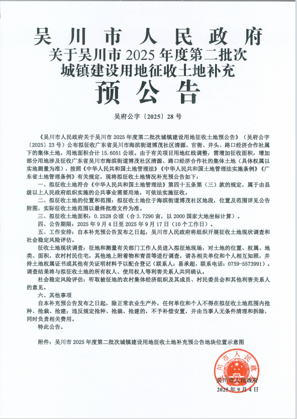 吴川市人民政府关于吴川市2025年度第二批次城镇建设用地征收土地补充预公告