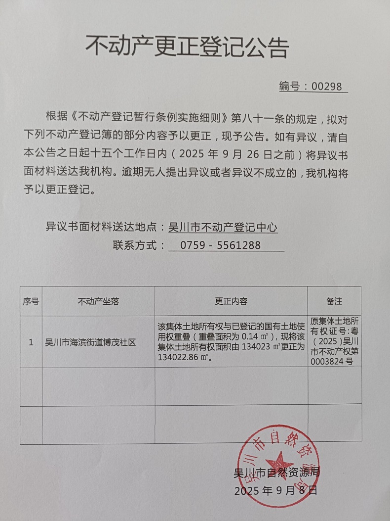 不动产更正登记公告(广东省吴川市海滨街道博茂社区大庙经济合作社)宗地面积:134022.86平方米