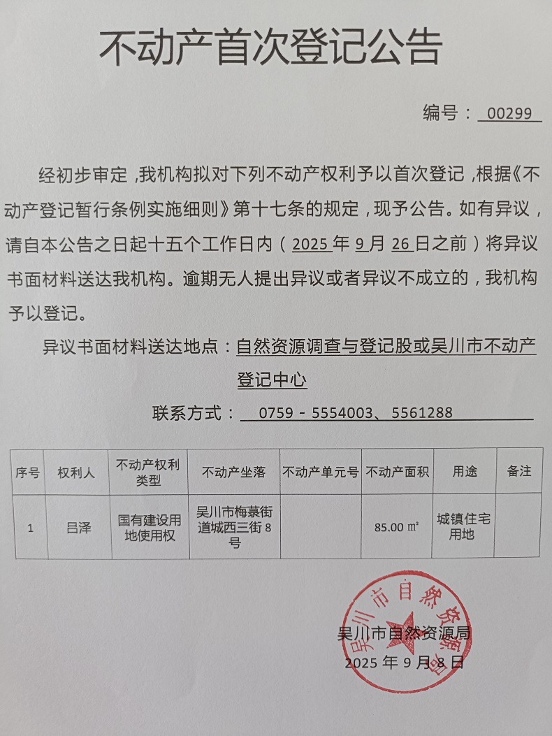 不动产首次登记公告(吕泽)宗地面积:85.00平方米
