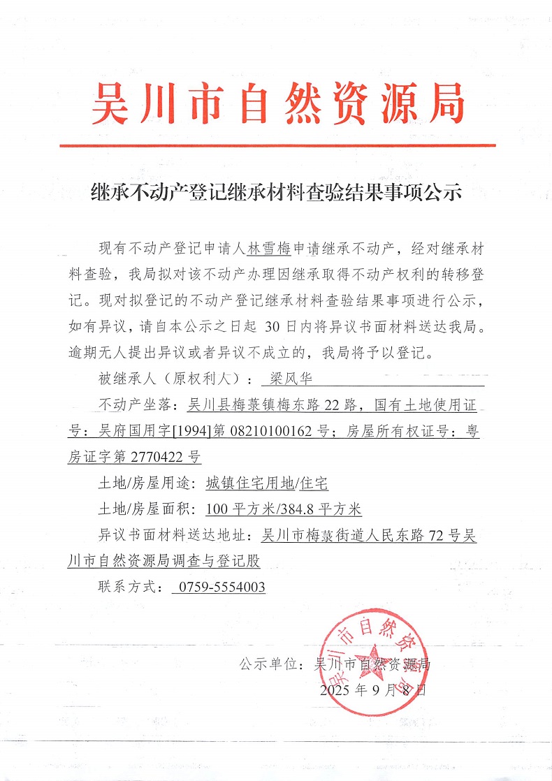 继承不动产登记继承材料查验结果事项公示(梁风华)