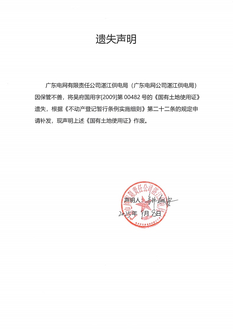 遗失声明:广东电网有限责任公司湛江供电局(吴府国用字[2009]第 00482 号)