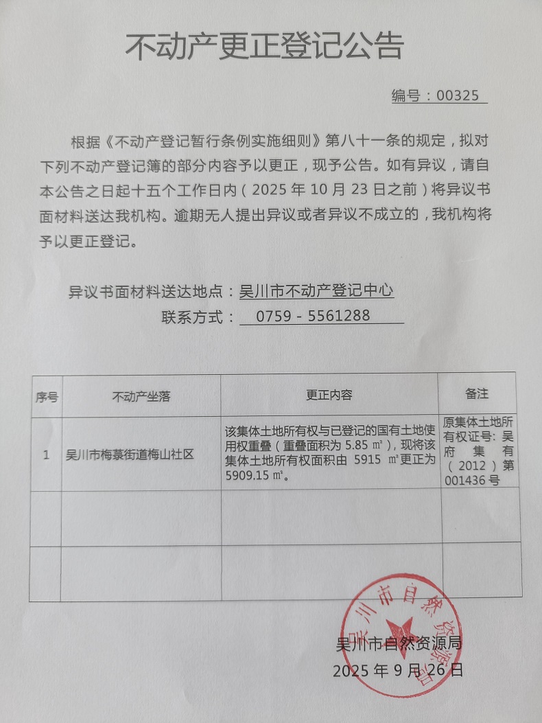 不动产更正登记公告(广东省吴川市梅菉街道梅山社区经济联合社)宗地面积:5909.15平方米