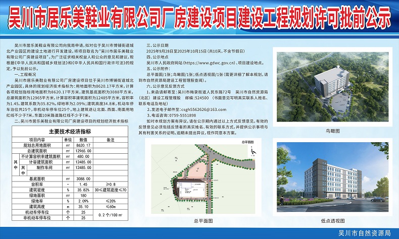 吴川市居乐美鞋业有限公司厂房建设项目建设工程规划许可批前公示
