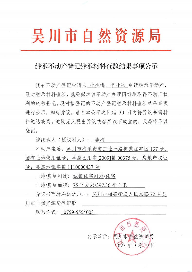 继承不动产登记继承材料查验结果事项公示(李柯)