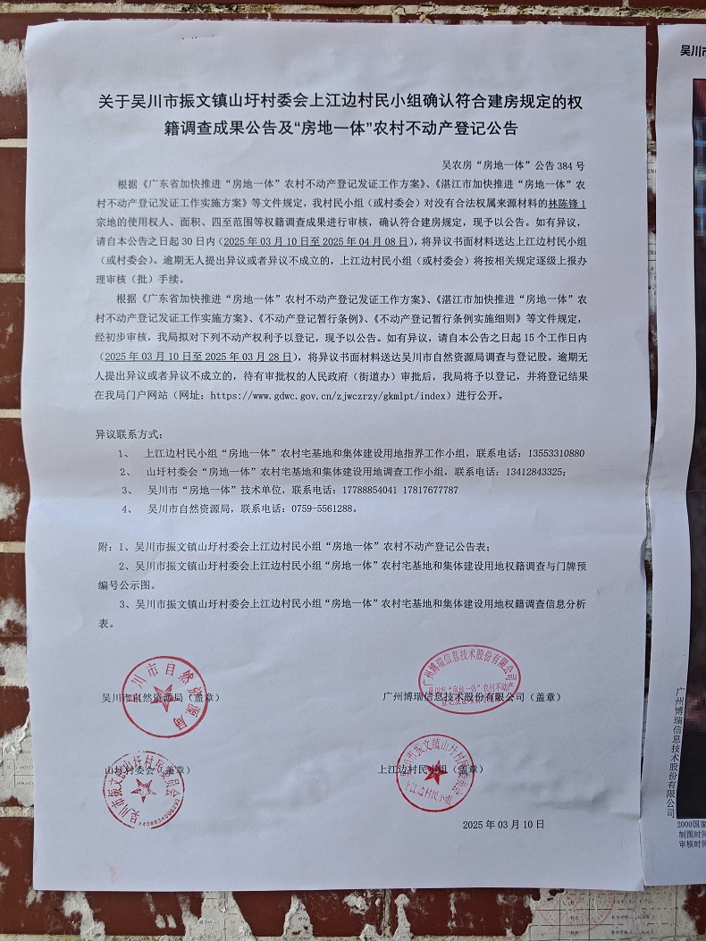 吴川市振文镇山圩村委会上江边村民小组确认符合建房规定的权籍调查成果公告及“房地一体”农村不动产登记公告