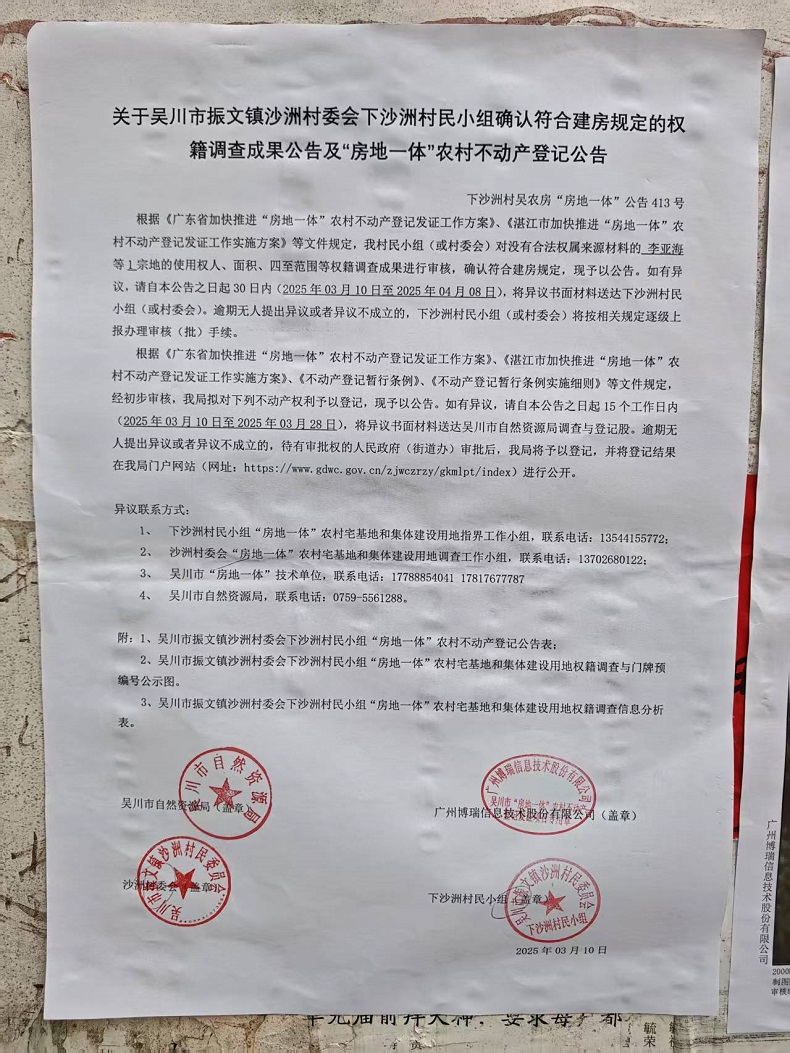 吴川市振文镇沙洲村委会下沙洲村民小组确认符合建房规定的权籍调查成果公告及“房地一体”农村不动产登记公告