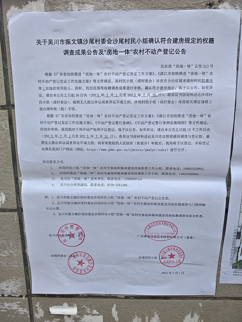 吴川市振文镇沙尾村委会沙尾村民小组确认符合建房规定的权籍调查成果公告及“房地一体”农村不动产登记公告