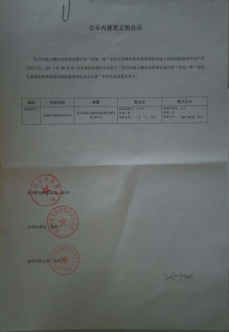吴川市振文镇沙尾村委会独竹村“房地一体”公示内容更正的公告