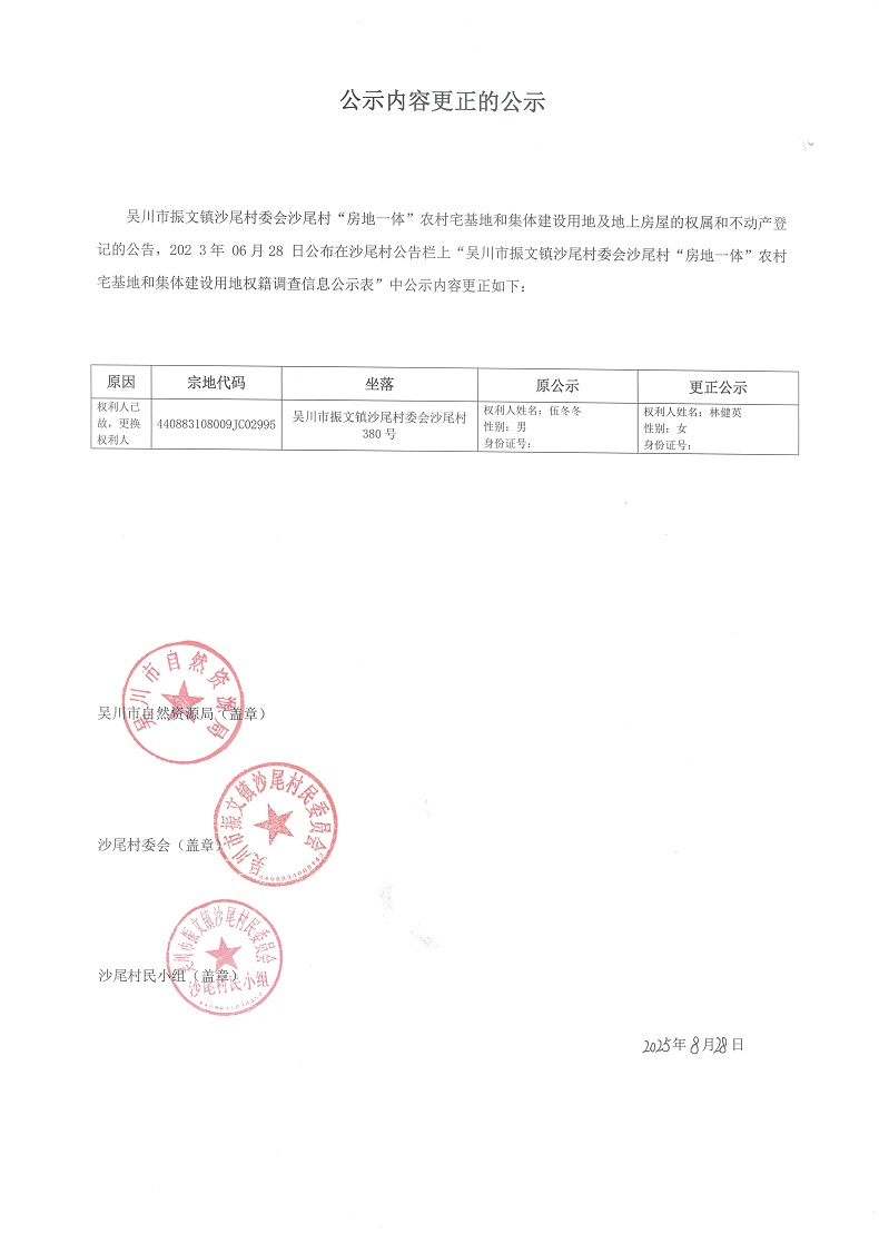 吴川市振文镇沙尾村委会沙尾村民小组“房地一体”农村宅基地和集体建设用地及地上房屋的权属和不动产登记的公告_01