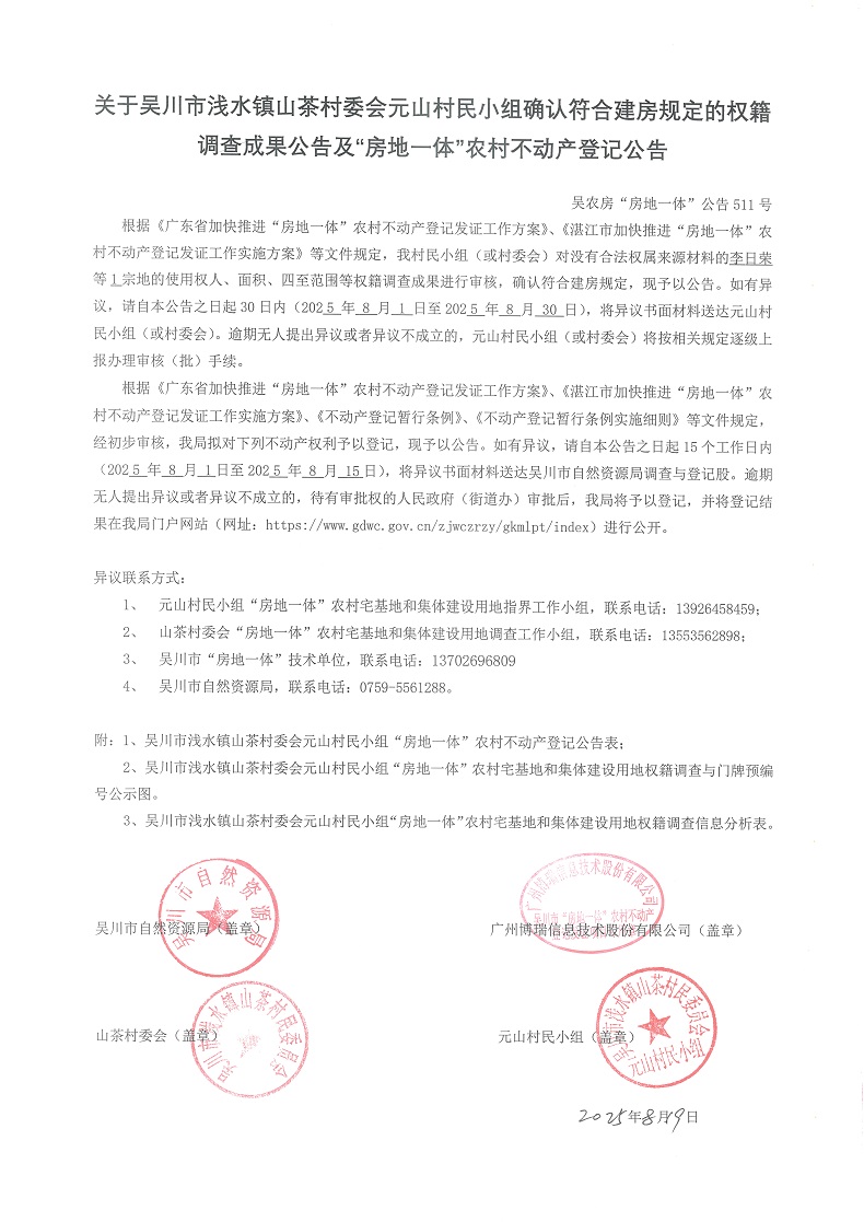 吴川市浅水镇山茶村委会元山村民小组“房地一体”农村宅基地和集体建设用地及地上房屋的权属和不动产登记的公告