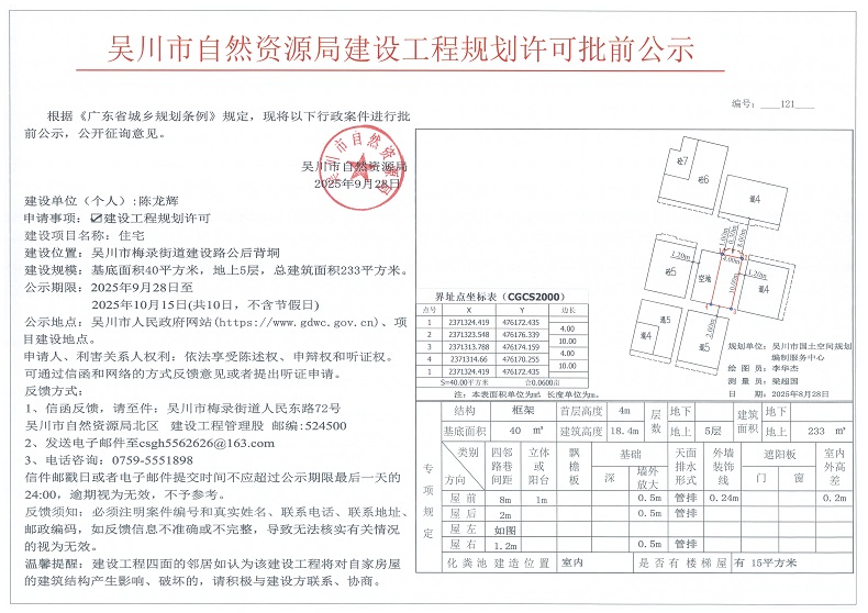 吴川市自然资源局建设工程规划许可批前公示(陈龙辉)