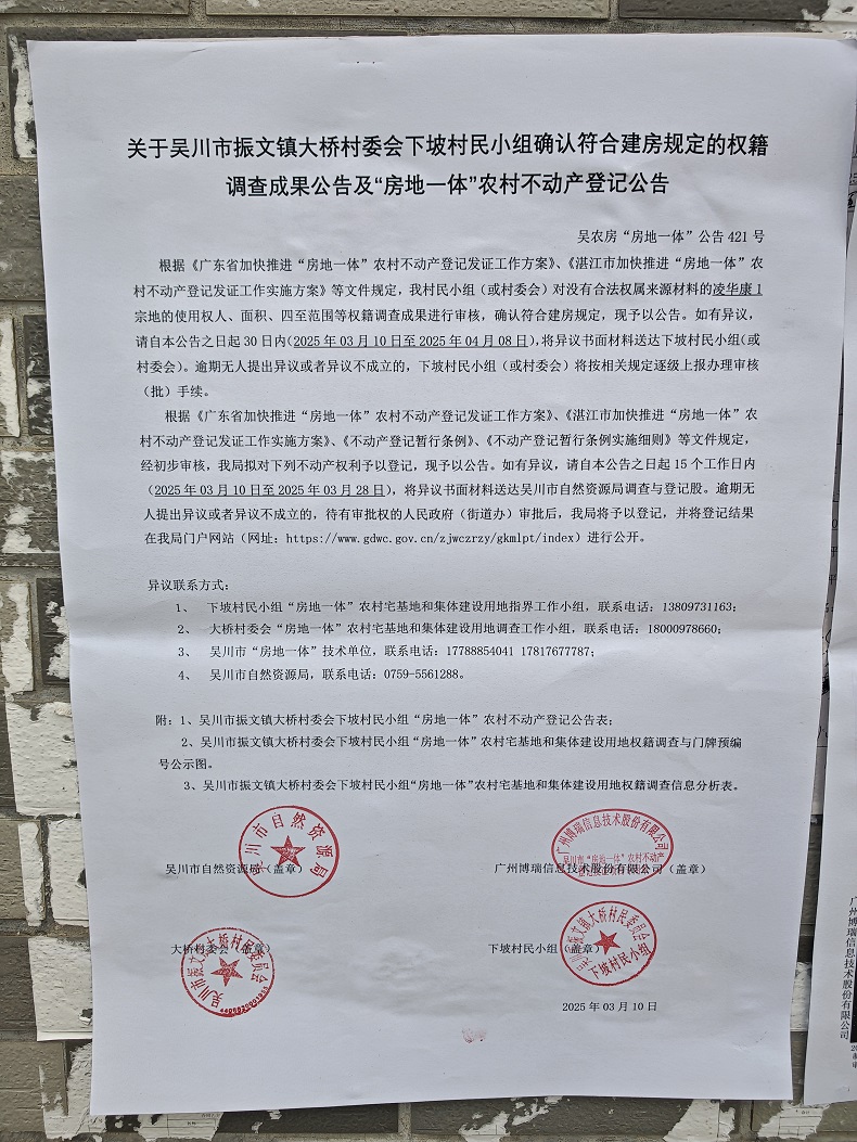 吴川市振文镇大桥村委会下坡村民小组确认符合建房规定的权籍调查成果公告及“房地一体”农村不动产登记公告