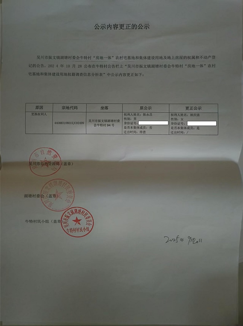 吴川市振文镇湖塘村委会牛特村“房地一体”公示内容更正的公告
