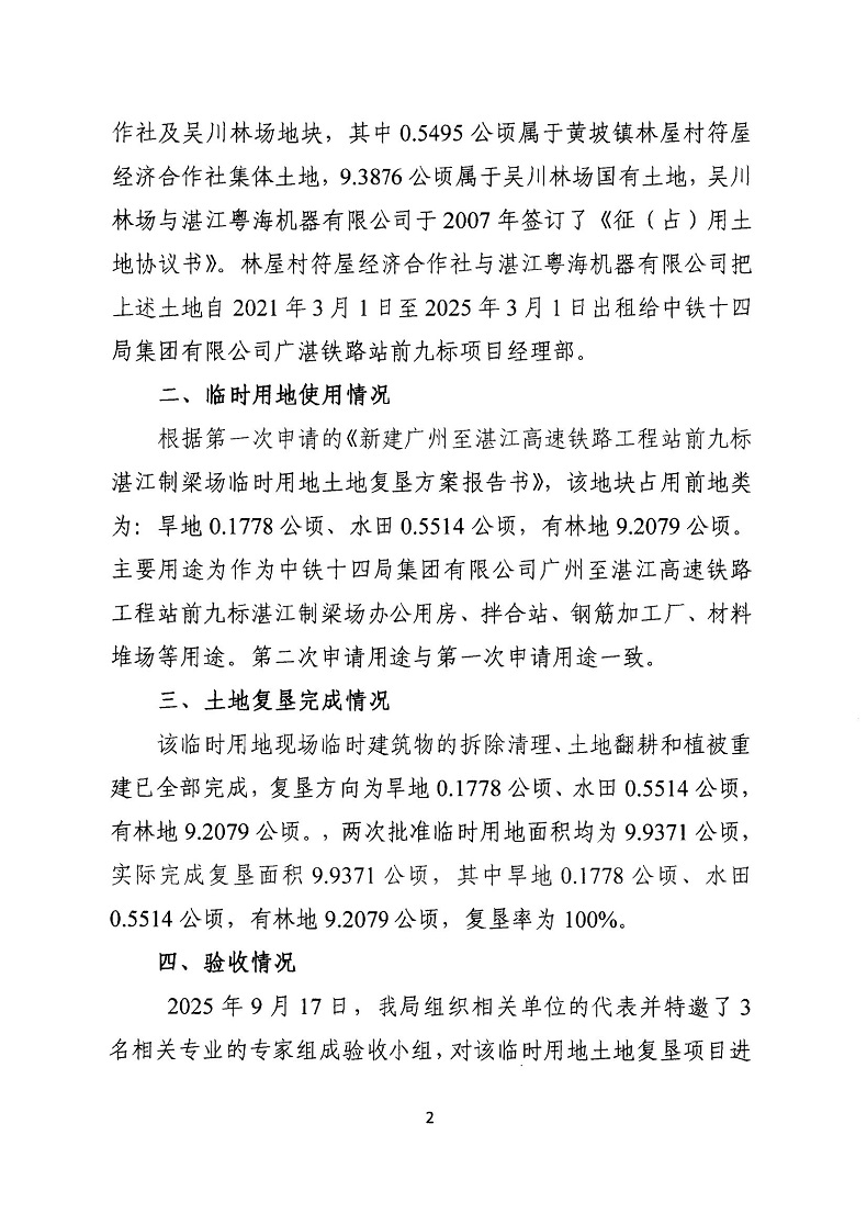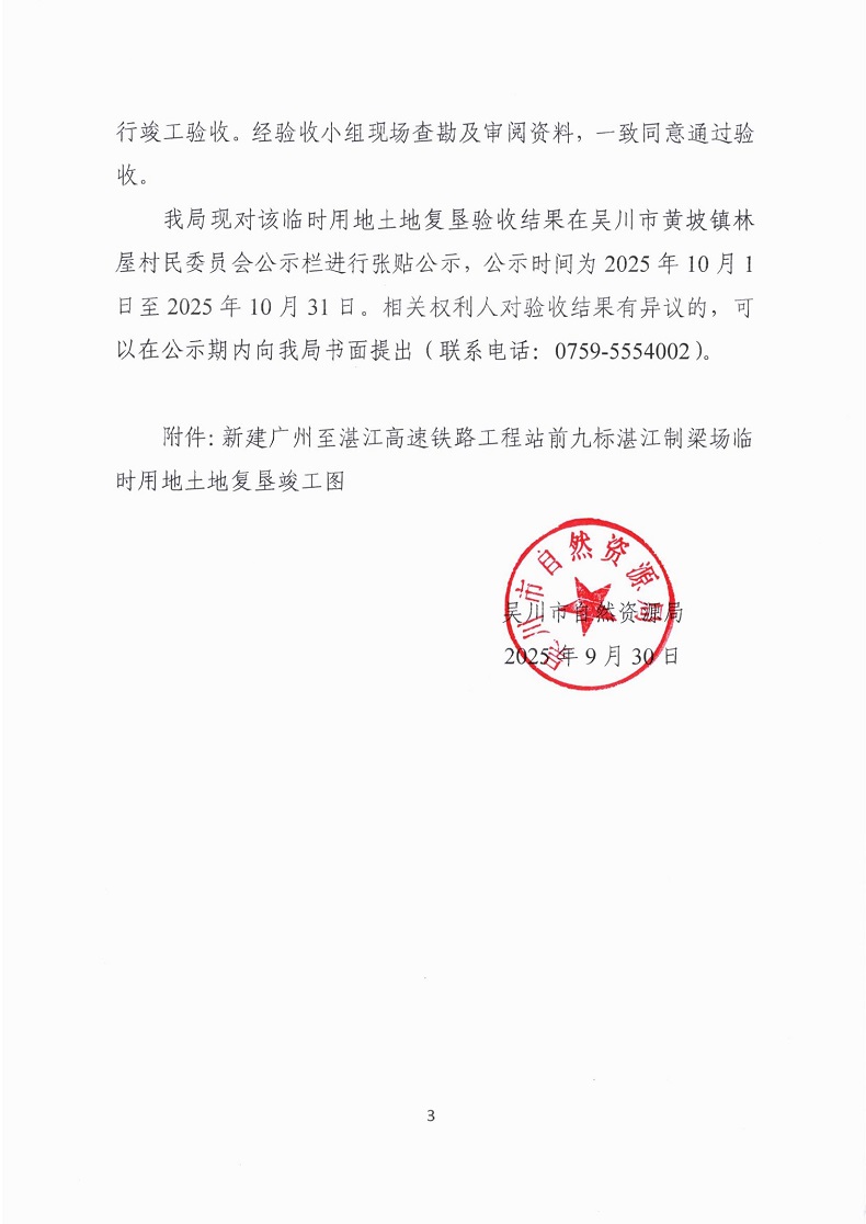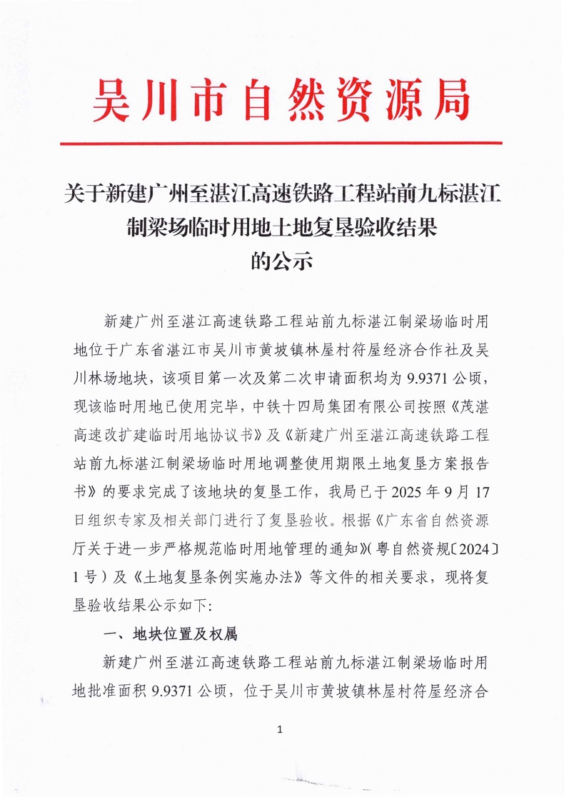 关于新建广州至湛江高速铁路工程站前九标湛江制梁场临时用地土地复垦验收结果的公示
