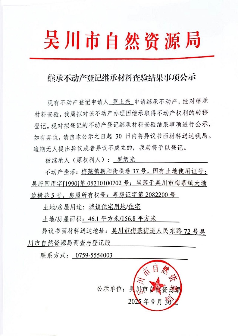 继承不动产登记继承材料查验结果事项公示(罗炳光)
