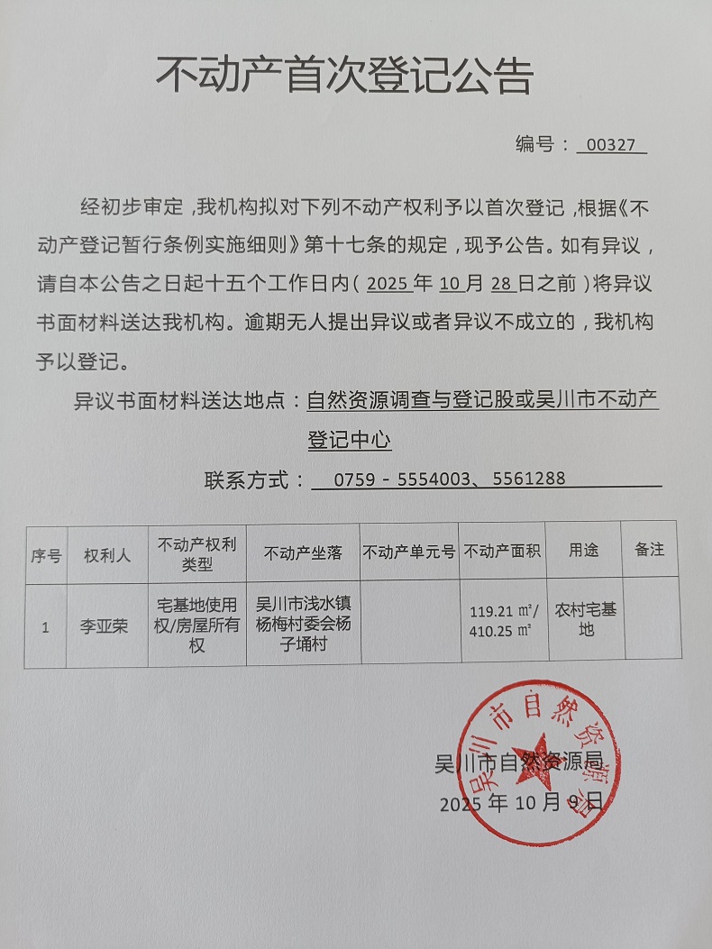 不动产首次登记公告(李亚荣)宗地面积:119.21平方米、建筑面积:410.25平方米