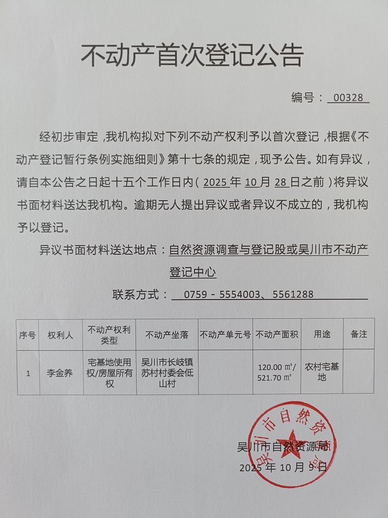 不动产首次登记公告(李金养)宗地面积:120.00平方米、建筑面积:521.70平方米