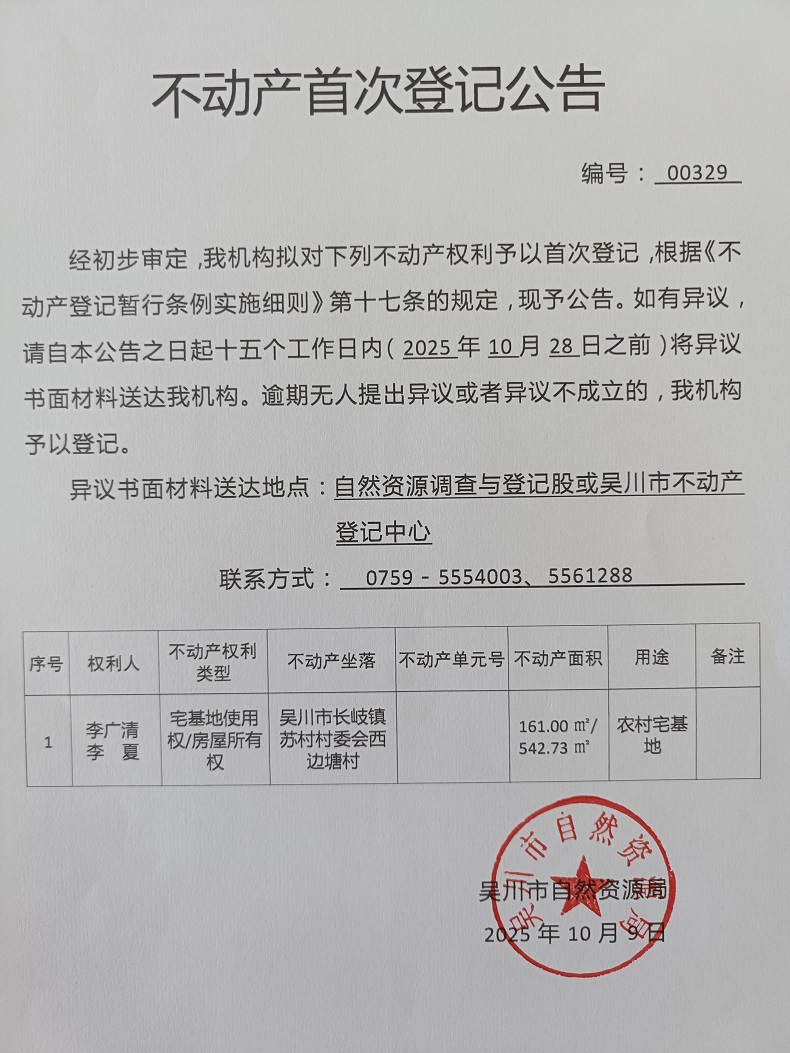 不动产首次登记公告(李广清、李夏)宗地面积:161.00平方米、建筑面积:542.73平方米