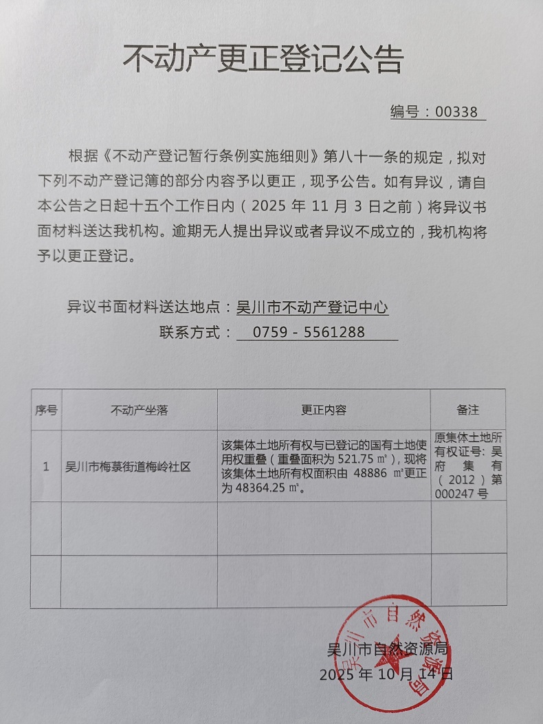 不动产更正登记公告(广东省吴川市梅菉街道梅岭社区坡心岭经济合作社)宗地面积:48364.25平方米