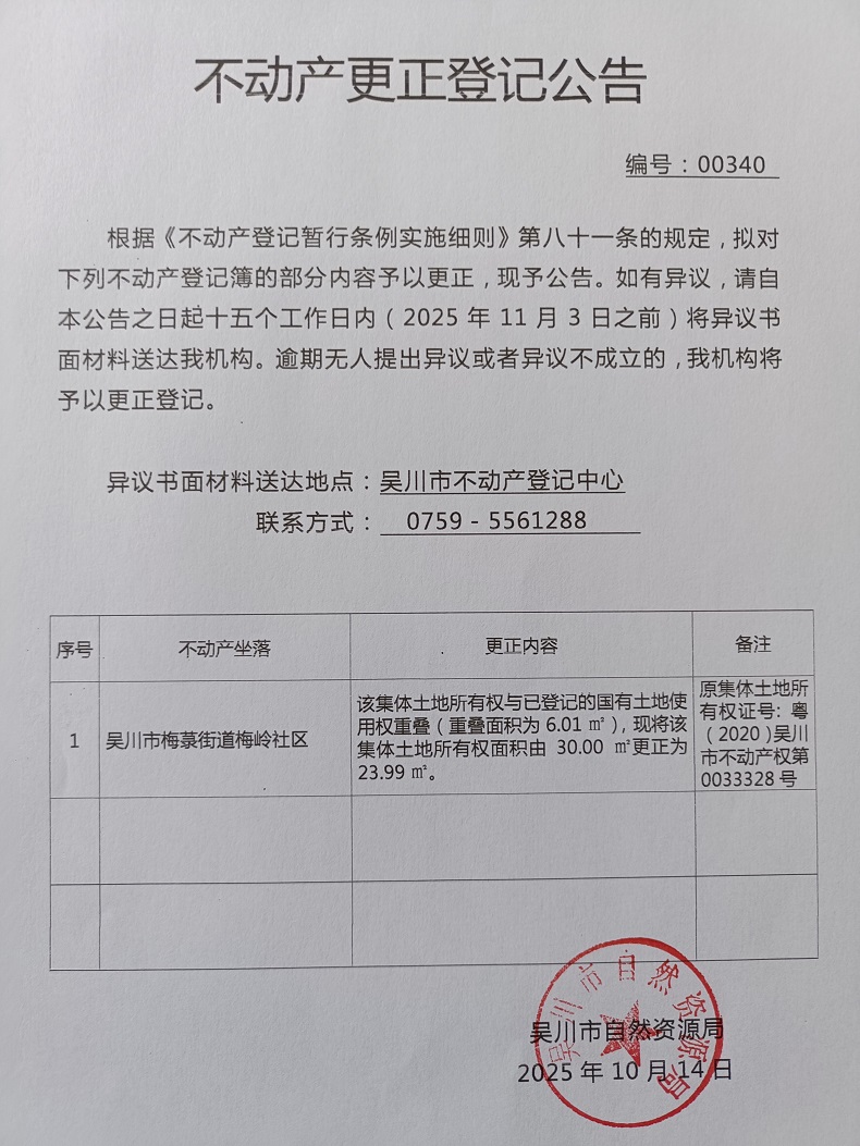 不动产更正登记公告(广东省吴川市梅菉街道梅岭社区蔗坡经济合作社)宗地面积:23.99平方米