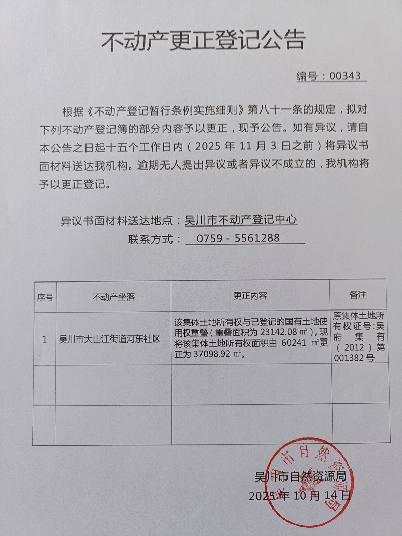 不动产更正登记公告(广东省吴川市大山江街道河东社区那孔经济合作社)宗地面积:37098.92平方米