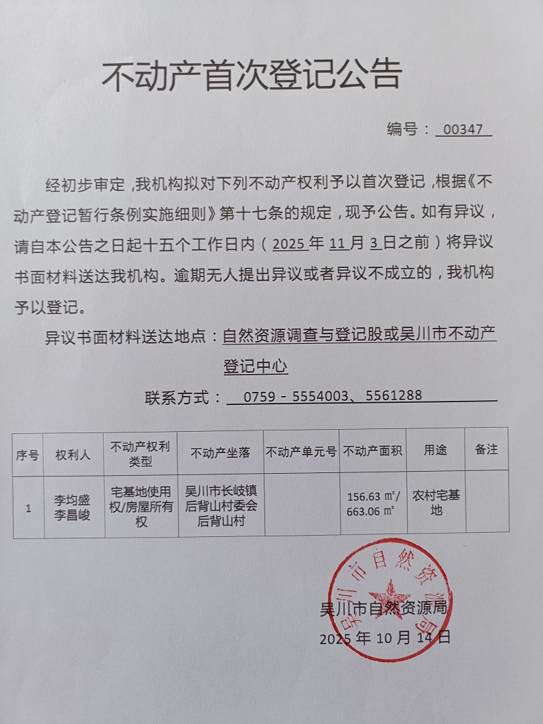 不动产首次登记公告(李均盛、李昌峻)宗地面积:156.63平方米、建筑面积:663.06平方米
