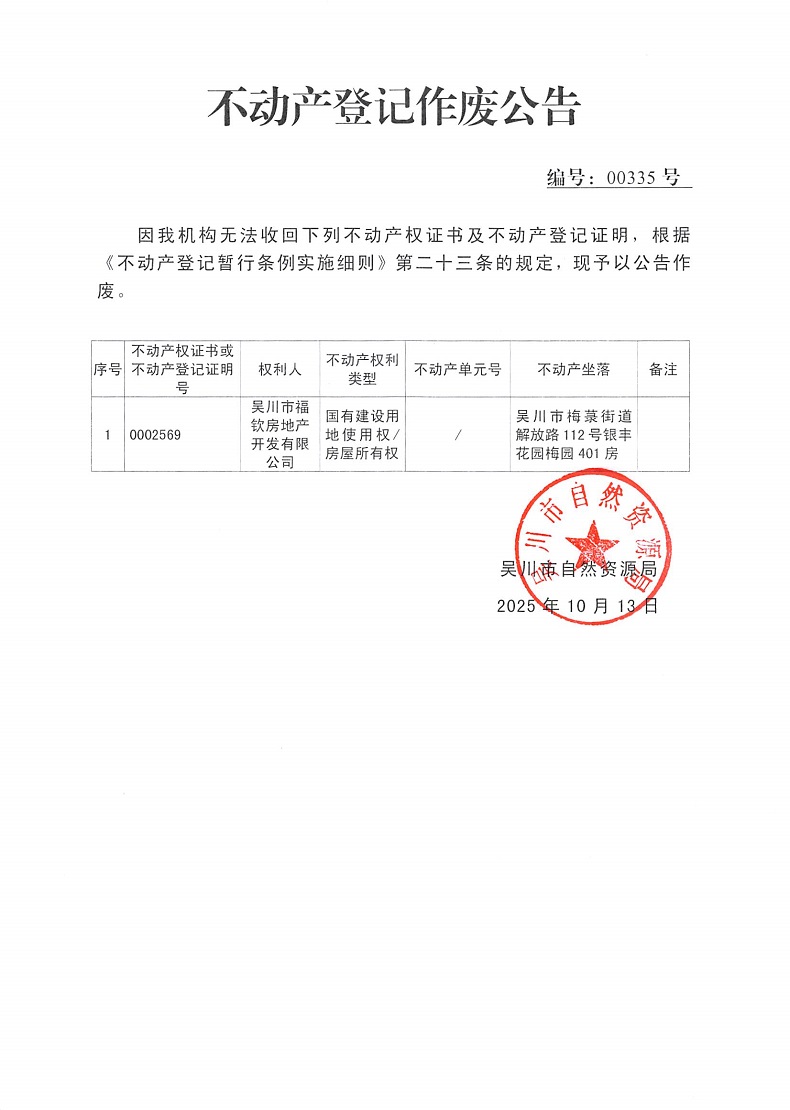 不动产登记作废公告(吴川市福钦房地产开发有限公司)