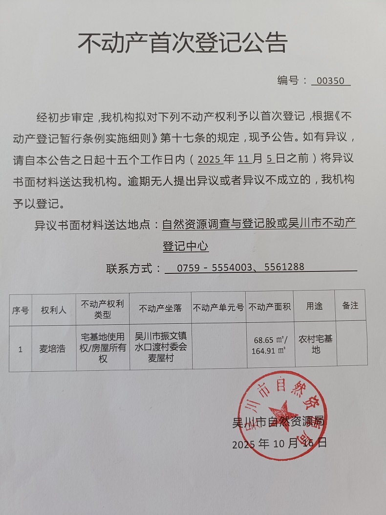 不动产首次登记公告(麦培浩)宗地面积:68.65平方米、建筑面积:164.91平方米