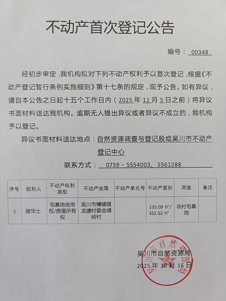 不动产首次登记公告(骆华土)宗地面积:105.09平方米、建筑面积:352.52平方米