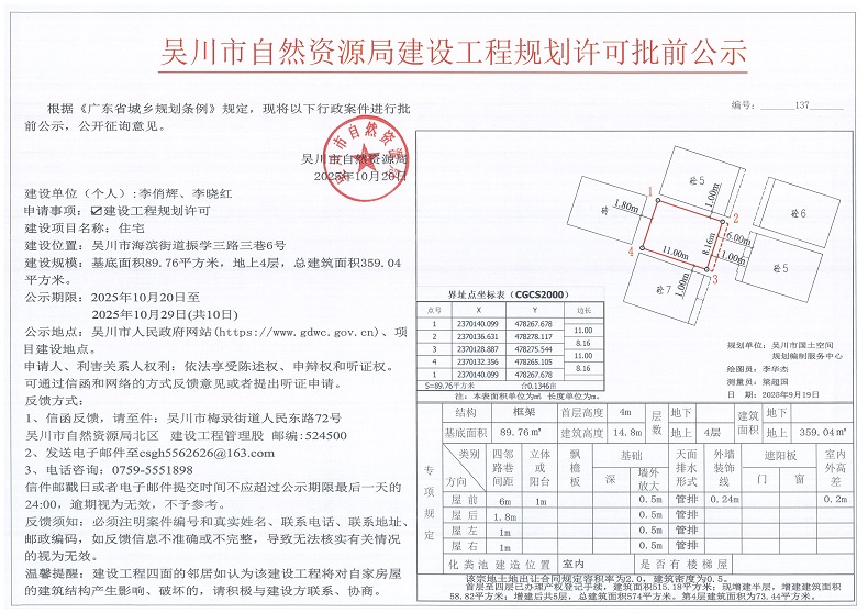 吴川市自然资源局建设工程规划许可批前公示(李俏辉、李晓红)