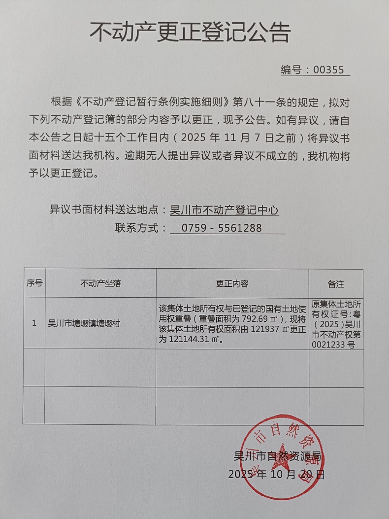 不动产更正登记公告(广东省吴川市塘㙍镇塘㙍村笋岭坡、大塘边、莲花、油麻坡、竹仔元、下圩、葵元经济合作社)宗地面积:121144.31平方米