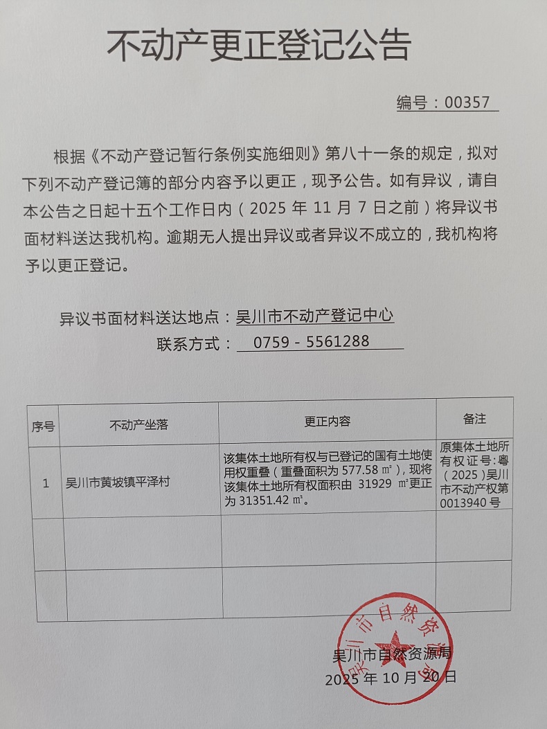不动产更正登记公告(广东省吴川市黄坡镇平泽村蛇地经济合作社)宗地面积:313514.42平方米