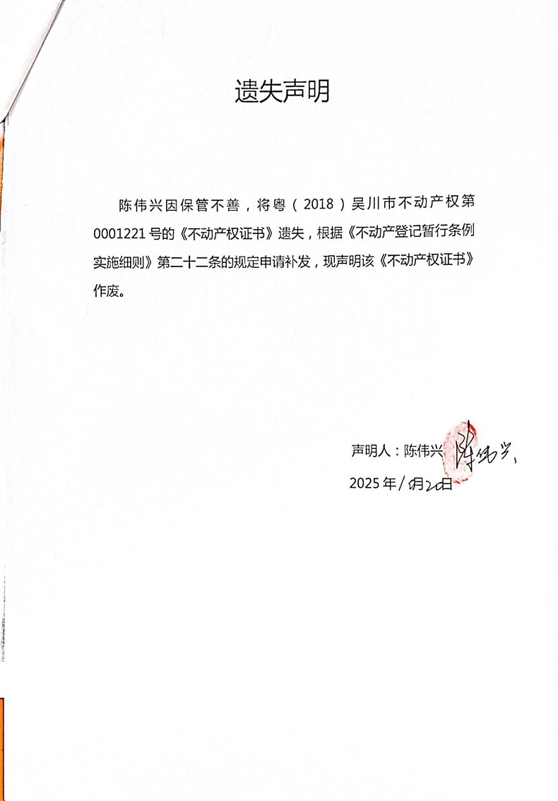 遗失声明(陈伟兴——粤(2018)吴川市不动产权第0001221号)