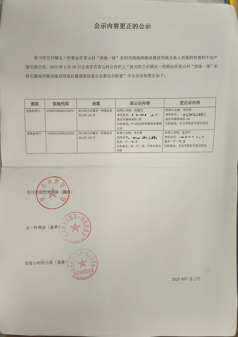 吴川市兰石镇五一村委会百官山村“房地一体”公示内容更正的公示