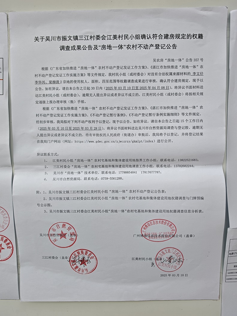 吴川市振文镇三江村委会江美村民小组确认符合建房规定的权籍调查成果公告及“房地一体”农村不动产登记公告