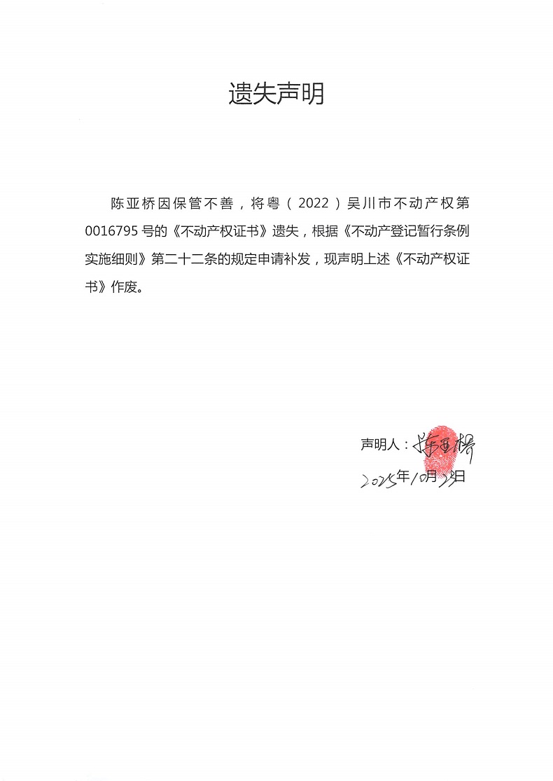 遗失声明(陈亚桥)