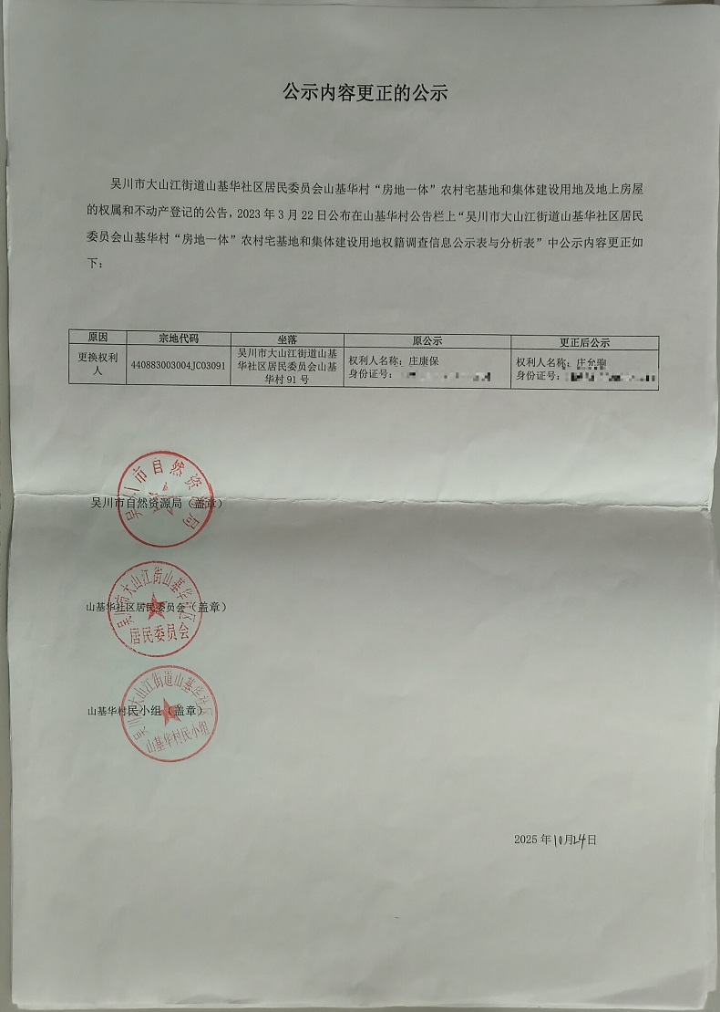 吴川市大山江街道山基华社区居民委员会山基华村公示内容更正的公示