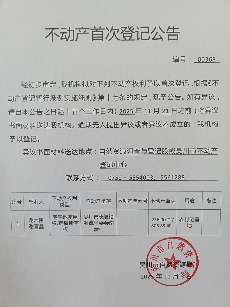 不动产首次登记公告(谢木伟,谢富鑫)宗地面积:236.00平方米、建筑面积:806.89平方米