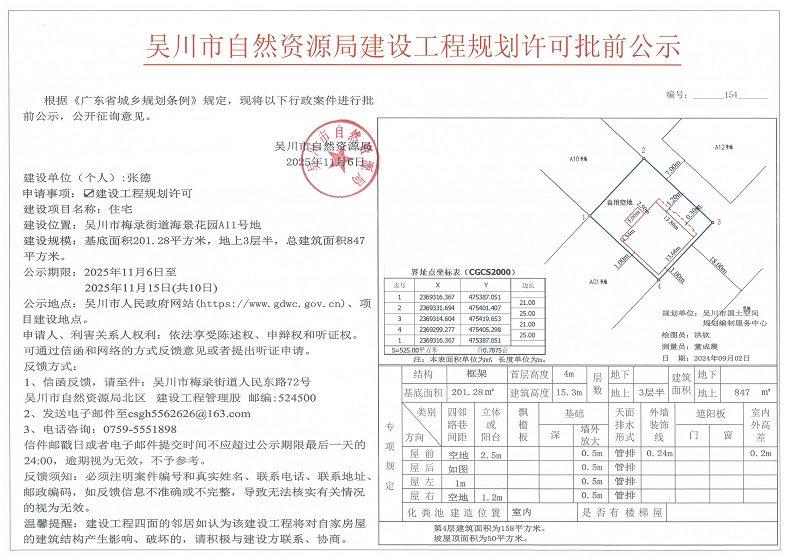 吴川市自然资源局建设工程规划许可批前公示(张德A11号地)