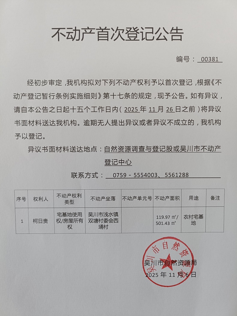不动产首次登记公告(柯日贵)宗地面积:119.97平方米、建筑面积:501.43平方米